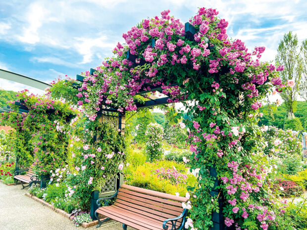 6種類の香りのタイプ別に植えられた「香りのエリア」や、 宿根草類とばらとの調和が美しい「ばらと草花のエリア」など8つのエリアがあり、 春と秋の開花時期には、 風に乗ってばらの芳醇な香りが辺り一面に漂います。