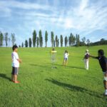 ディスクをバスケット状のゴールに投げ入れ、 全18ホールのトータルスコアを競うスポーツです。 ディスクは花と緑の館で無料貸出しています。