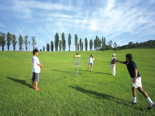 ディスクをバスケット状のゴールに投げ入れ、 全18ホールのトータルスコアを競うスポーツです。 ディスクは花と緑の館で無料貸出しています。