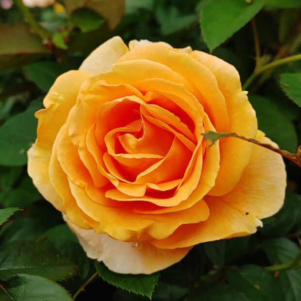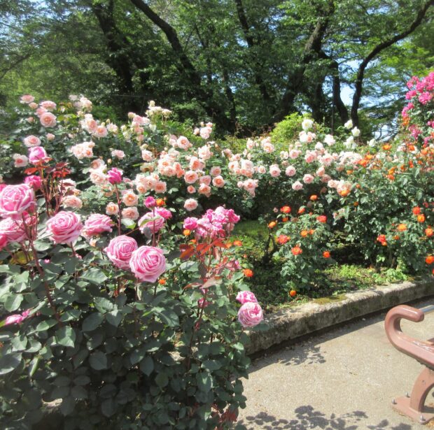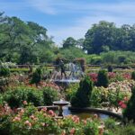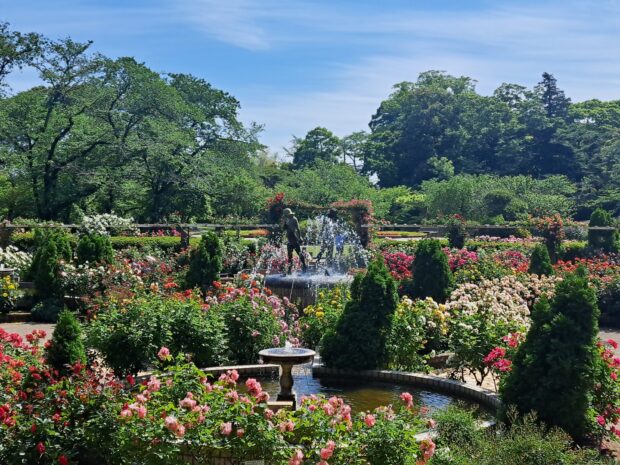 噴水を中心にした西洋庭園。 112種のバラが植えられています。