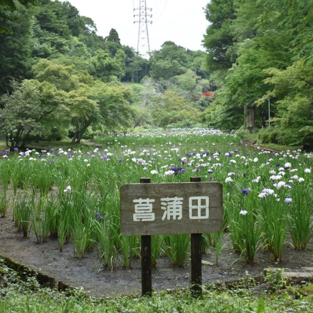 泉自然公園の菖蒲田(2,700平方メートル)では、 約6,000株、 約12品種のハナショウブ(花菖蒲)を栽培しています。 5月下旬から咲きはじめ6月中旬頃に見ごろを迎えます。 梅雨空に映える紫や白など色とりどりのハナショウブを鑑賞できます。 また、 菖蒲田の周囲ではアジサイの花も見られます。