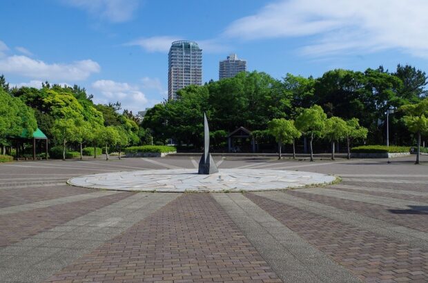 創作の広場にある大きな日時計です。 周りは広い石畳が広がります。