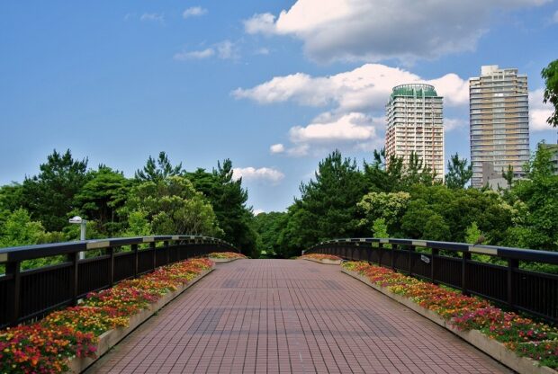 大芝生広場等からパークセンターに行くために、 道路を横断しないで渡るための橋です。 橋の両側には花壇があり目を楽しませてくれます。 また秋はイチョウ並木の黄葉も楽しめます。