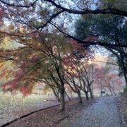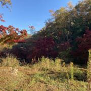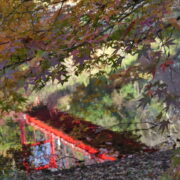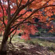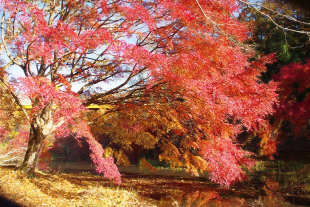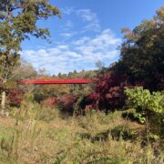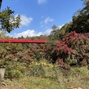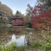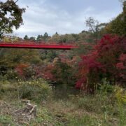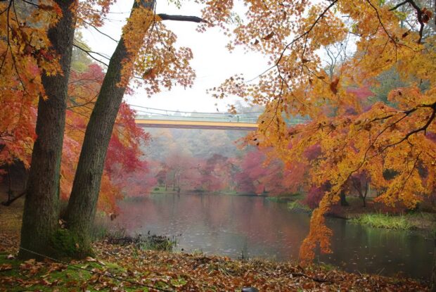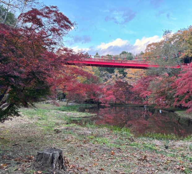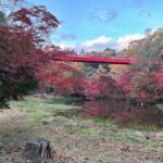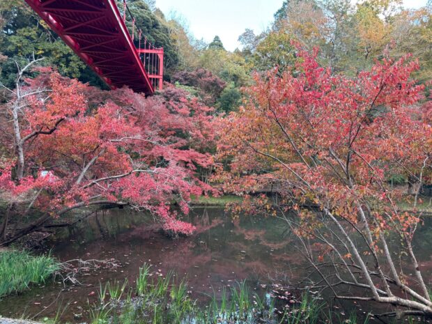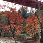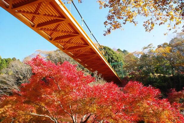 下から見るいずみ橋が美しいです。 秋、 いずみ橋とイロハモミジ、 カラコギカエデの紅葉の組み合わせが美しいです。