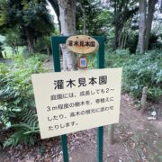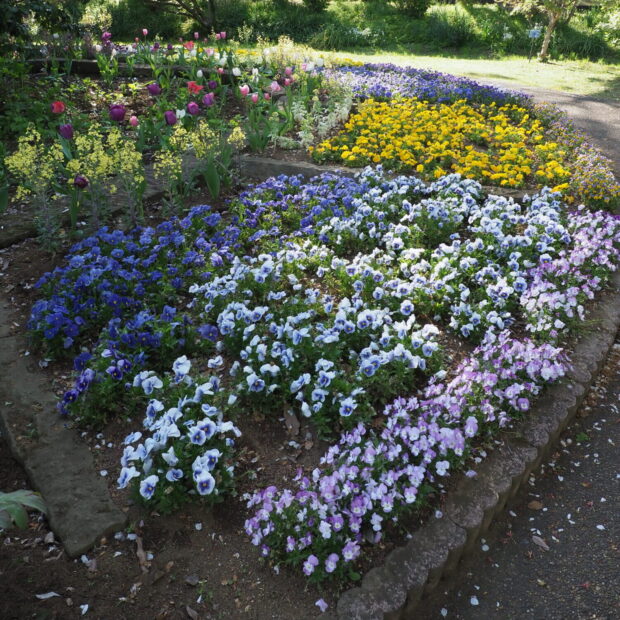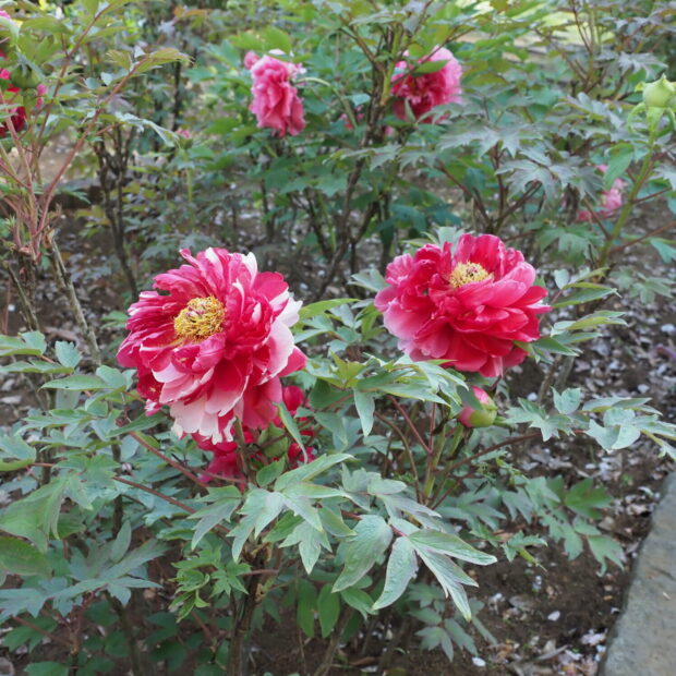 成長しても数mの樹木が栽培されています。 向かい側の花壇では、 草花や牡丹の花が見られます。 滝の流れや音にも癒される場所でもあります。