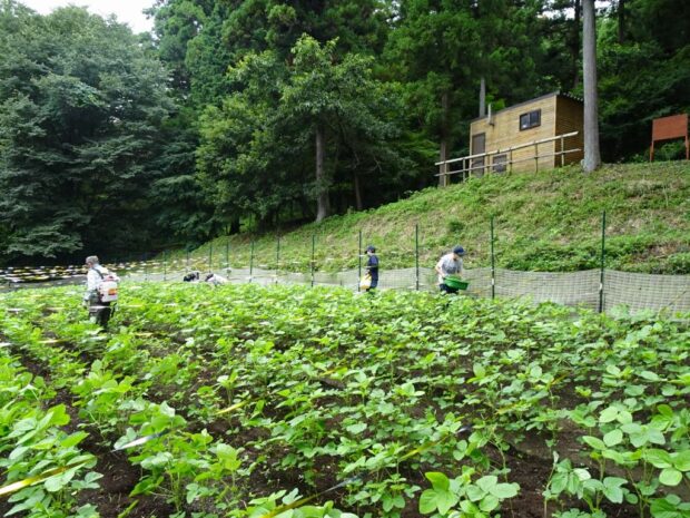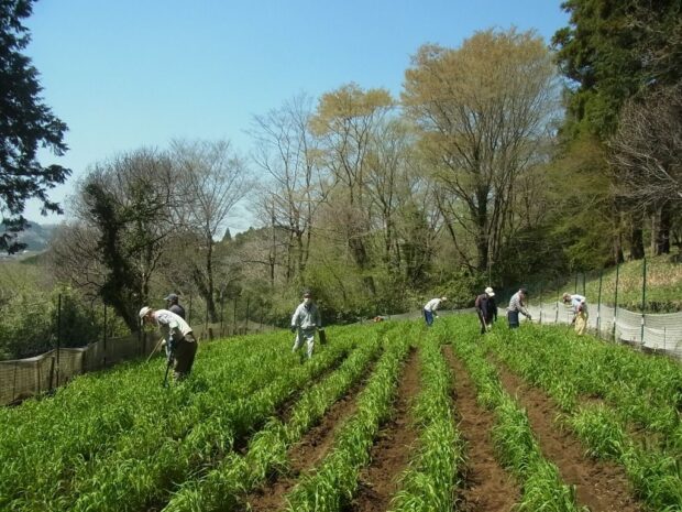 SKTボランティア(公園ボランティア)畑班が、 夏には小麦を中心に、 秋には津久井在来大豆を育てています。 収穫した小麦からうどんを、 大豆からは味噌も皆で作っています。 柵をして、 イノシシやニホンジカから守っています。