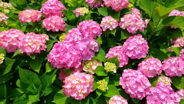 C地区の旧中川へ向かう園路の両側はアジサイロードです。 西洋アジサイやガクアジサイ、 ヤマアジサイなどが咲いています。