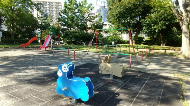 A地区の遊具広場には、 砂場、 すべり台などの遊具があり、 毎日子供たちでにぎわっています。