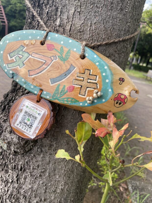 きれいな樹名板。 横の葉はアオスジアゲハの幼虫に食われたかな?