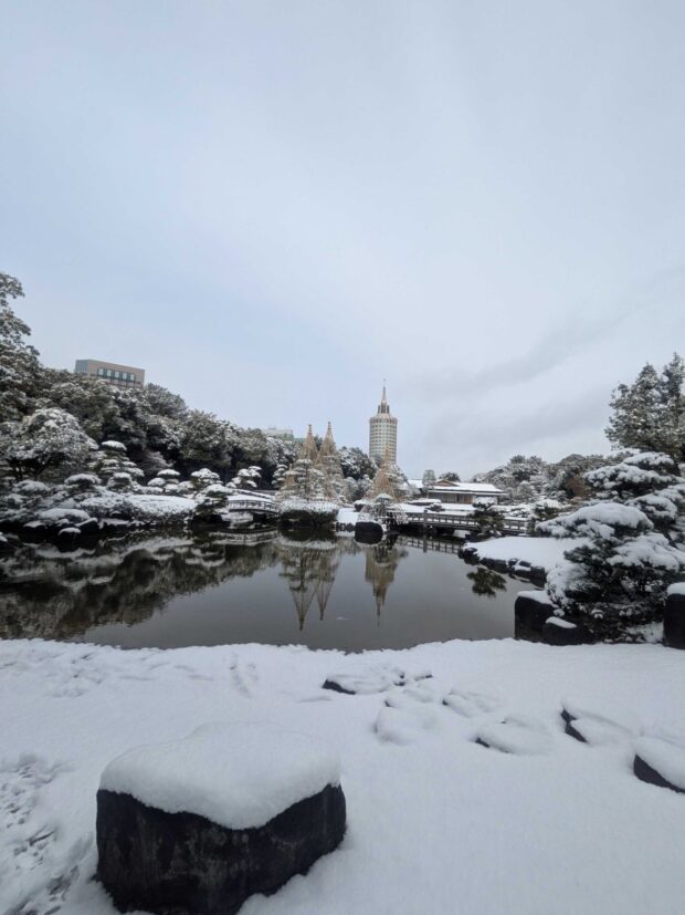 ビルと日本庭園の雪景色。 幕張海浜公園ならでは。